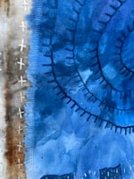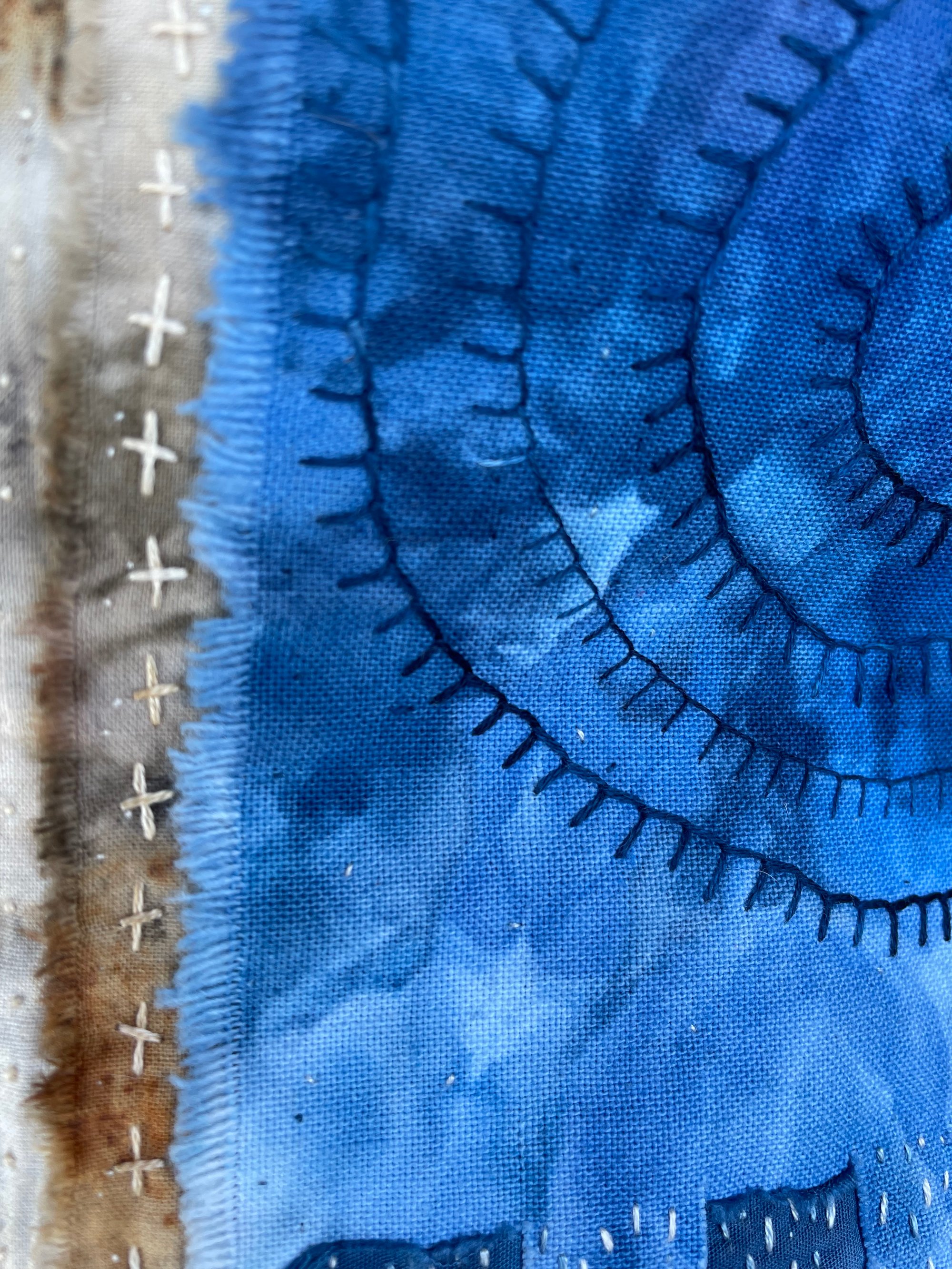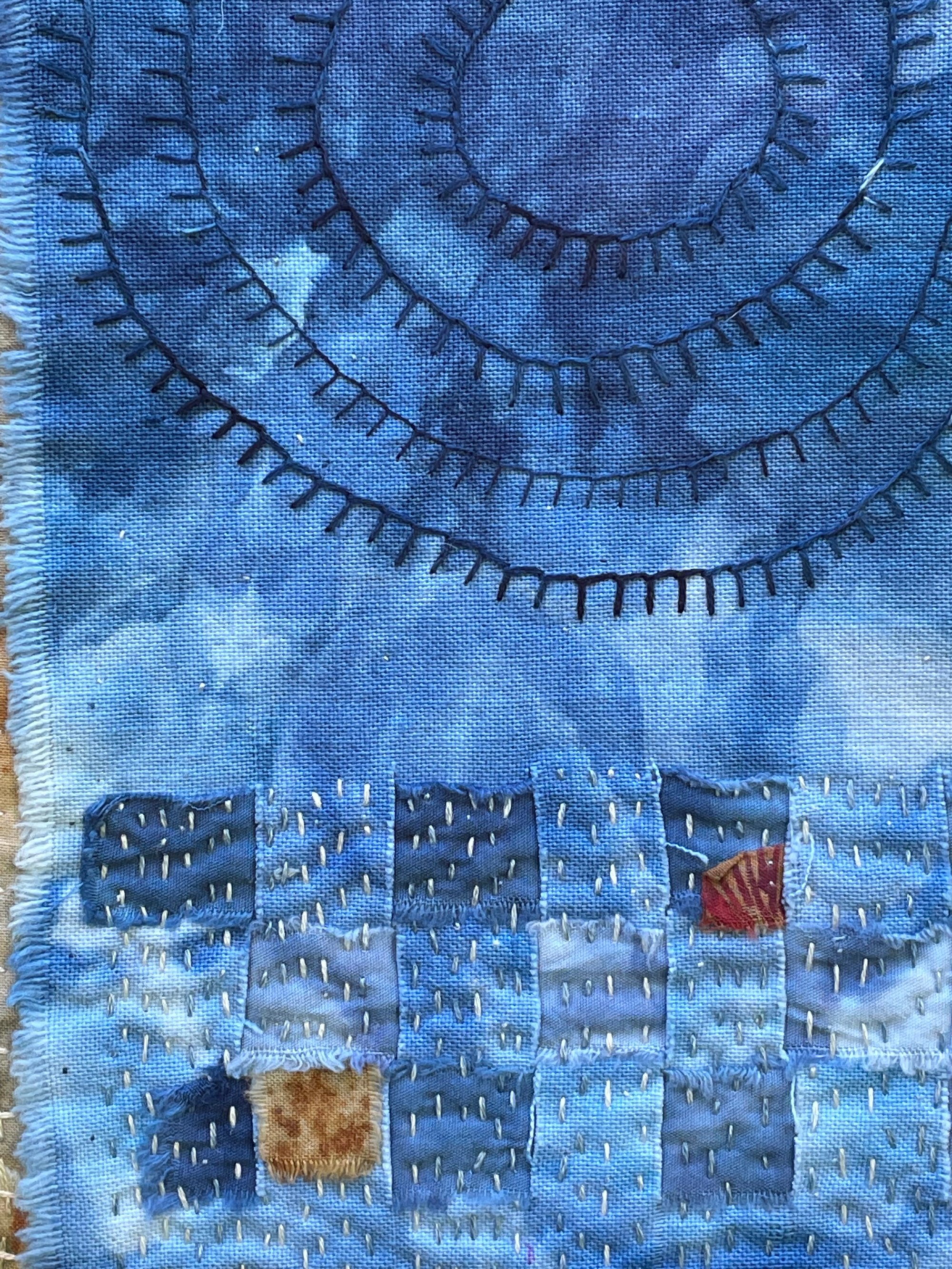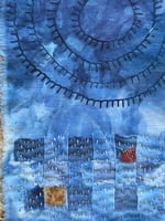 A small gathering of some vintage fabrics that are indigo dyed and hand dyed fabrics, then all lovingly slow stitched together. It could be framed for your home to remind you each time you see it of how the smallest loving acts of kindness have a ripple effect. Approximately 6” x 9” plus 4.5"fringe.